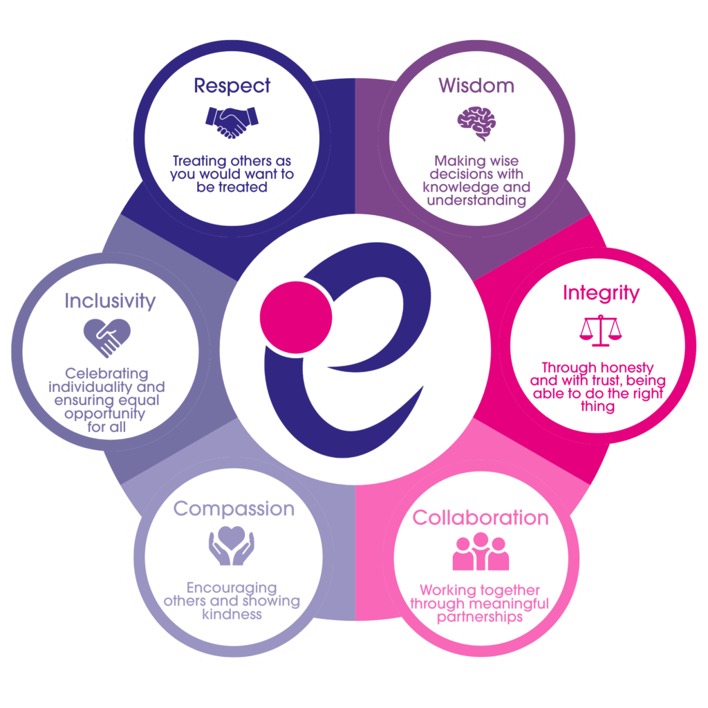 Every family is welcomed, valued and respected, with equity at the heart of our offer and support for all to create a culture of safety, dignity, and hope. We celebrate uniqueness and diversity, communicate openly and compassionately, and remove glass ceilings so ambition is possible for every child and family. Together we build relationships of trust, working in partnership to foster aspiration and flourishing futures for our children.